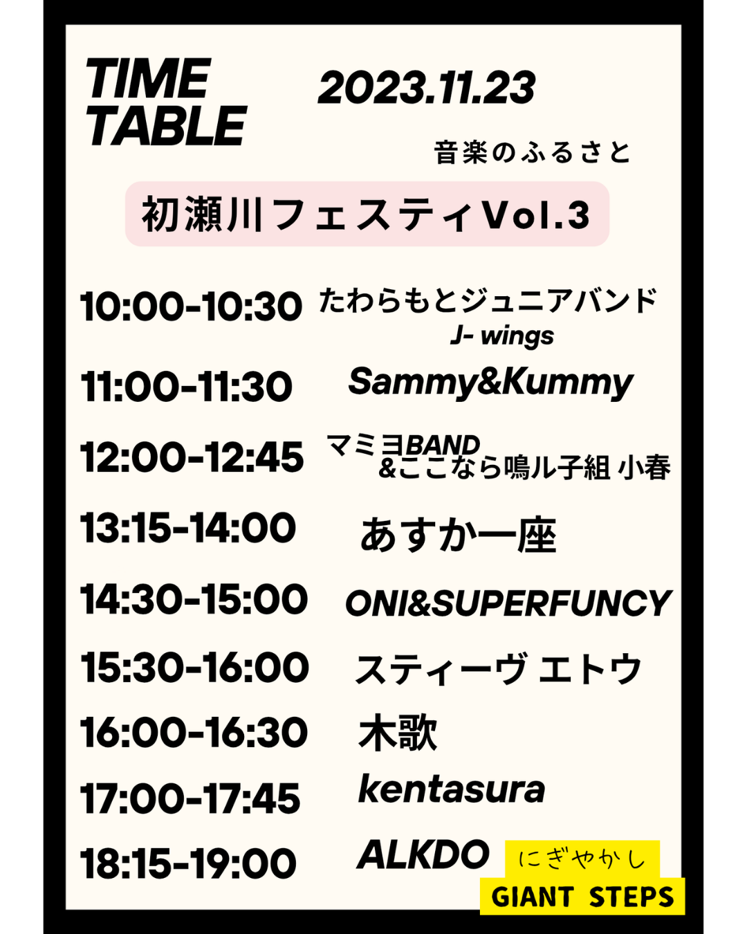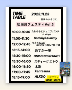 初瀬川フェスティバルvol.3 タイムテーブル 2025年11月21日 イベント 第三回音楽のふるさと 初瀬川フェスティバル タイムテーブルです!! 入場無料(投銭歓迎)皆様のお越しを心よりお待ちしています!! Share: hirochan Author Older Post 音楽のふるさと 初瀬川フェスティバルVol.3